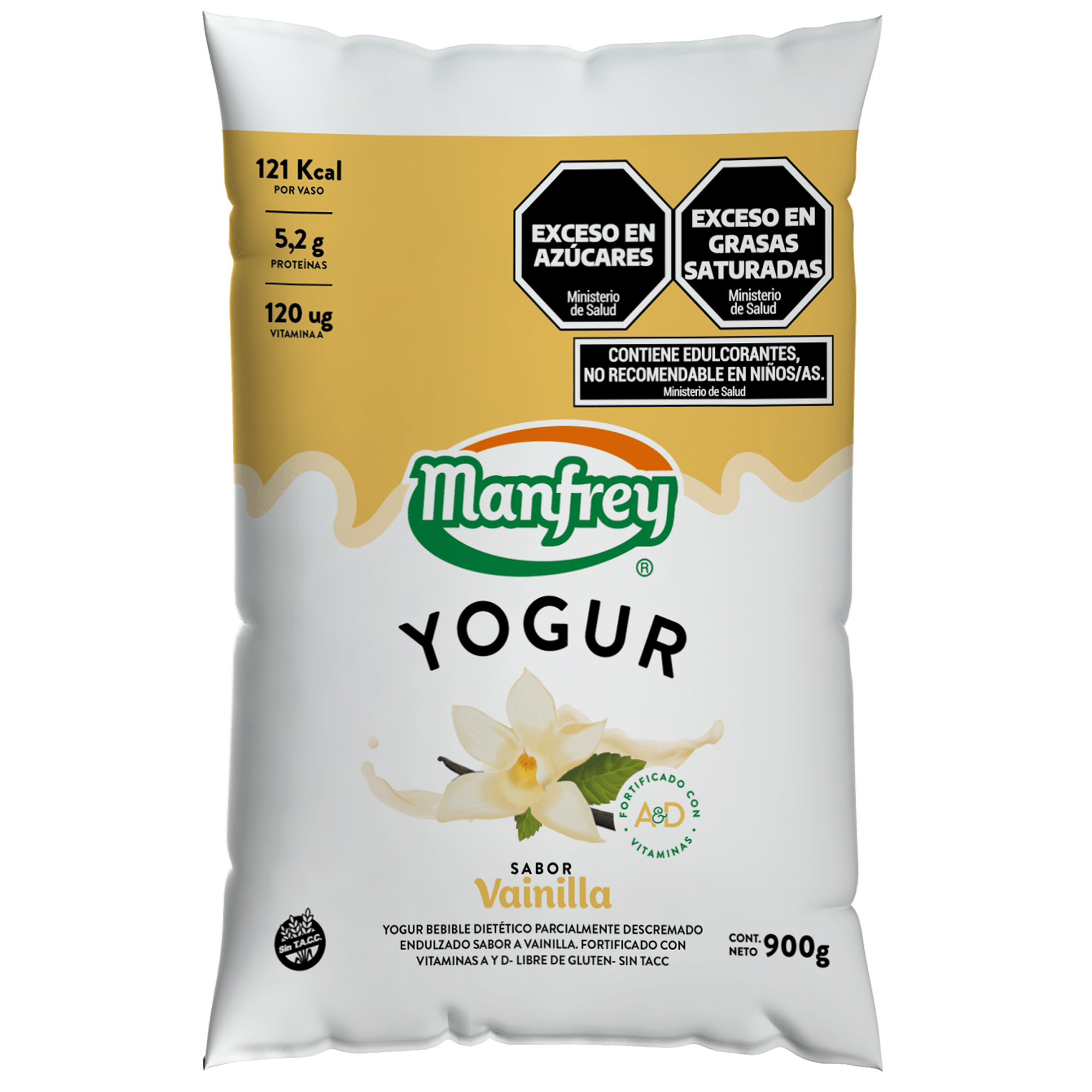Yogur bebible dietético parcialmente descremado endulzado sabor a vainilla. Fortificado con vitaminas A y D- libre de gluten- SIN TACC.